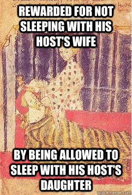 Up to this point, the text seems focused on how Gawain's courtesy is so effective that he willingly steps across social boundaries. Things get somewhat more muddled when the Carle invites Gawain to kiss his wife, and, as thanks for not pushing into heavy petting and beyond, grants the knight his daughter to have sex with as he pleases for the night. After this, the Carle pronounces that he'll no longer test knights in this manner, even showing Gawain the evidence of how he has slain the knights that fail his tests in the past, and is eventually made a knight of Arthur's court.
